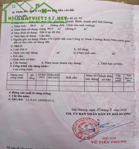 CHÍNH CHỦ BÁN ĐẤT ĐẸP – VỊ TRÍ VÀNG CHỢ HỘI ĐÔ ♦ Cơ hội đầu tư & an cư cực hiếm tại KĐT Tây Nam Cường – TP Hải Dương♦ Vị trí: KĐT phía Tây, P. Thanh Bình, TP Hải Dương➡️ Cách chợ Hội Đô chỉ ~50m – khu vực buôn bán sầm uất, cực kỳ tiềm năng♦ Thông tin chi tiết:Diện tích: 96m²Mặt tiền: 6mHướng: Bắc ghé TâyLô góc 2 mặt tiền ⇒ cực thoáng, thuận tiện vừa ở vừa kinh doanh/kho bãi♦ Giá bán: Hơn 4,25 tỷ (có thương lượng cho khách thiện chí)♦ Phù hợp:✔️ Ở kết hợp kinh doanh✔️ Đầu tư sinh lời✔️ Làm kho, cửa hàng, văn phòng► Liên hệ chính chủ: 0988 471 124♦ Anh chị em môi giới có khách ghép – hợp tác nhanh gọn!