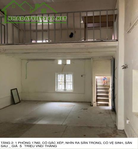 - 1 phòng 17m2 ở tầng 2, gồm 1 tầng lửng, 1 vệ sinh, 1 sân sau. Giá thuê: 4,5 triệu vnd/ tháng