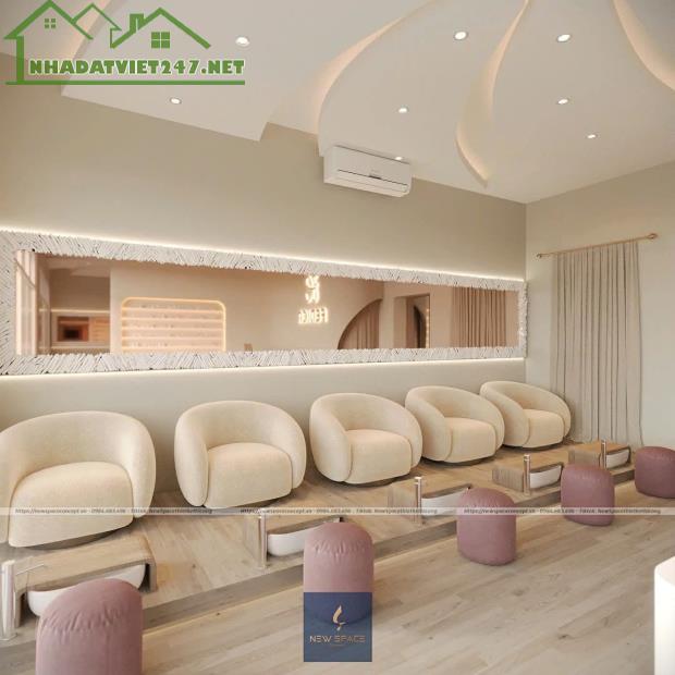 - Khu Mi/Sấy/Massage: 2 giường gội, 2 ghế nâng hạ mi, 2 giường massage, bàn gương LED.